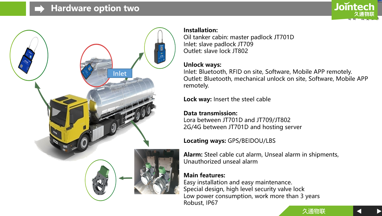 JT802 Tank Truck Smart Valve Lock is a sub-lock used with JT701D. It is equipped with a disposable lithium-manganese battery, low power consumption, can be used for a long time( two years if the lock is on and off ten times a day).